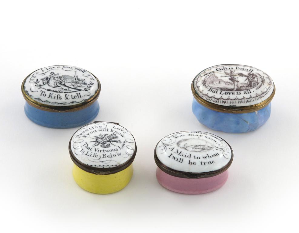 Four Bilston enamel patch boxes late 18th/early 19th century, variously printed with courting lovers, Cupid, and a landscape scene between inscriptions including 'Practise Love & you will know The Virtuous Love Is Life Below', and 'I love too well to Kiss and Tell', the bases coloured yellow, pink and blue, all with mirrored interiors, some faults, 4.5cm max. (4)