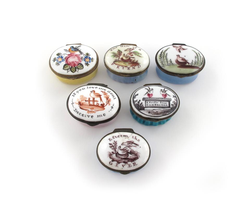 Six enamel patch boxes early 19th century, variously painted with birds in nests, and perched on flowers, fences or signs, titled with mottoes including 'If you love me don't Deceive me', 'Esteem the Giver' and 'A Trifle from Cambridge', five with mirrors to the interior, some restoration, 4.2cm max. (6)