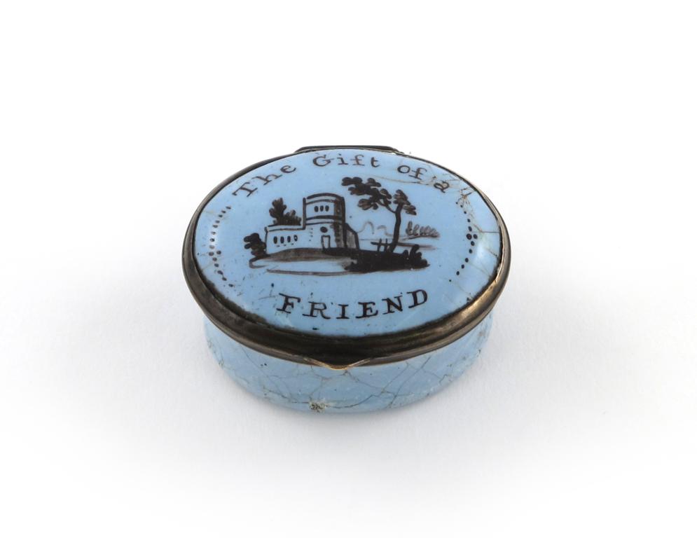 An enamel patch box late 18th century, painted in black with a landscape scene and titled 'The Gift of a Friend' on a pale blue ground, the interior fitted with a mirror, cracks to the enamel, 3.7cm.
