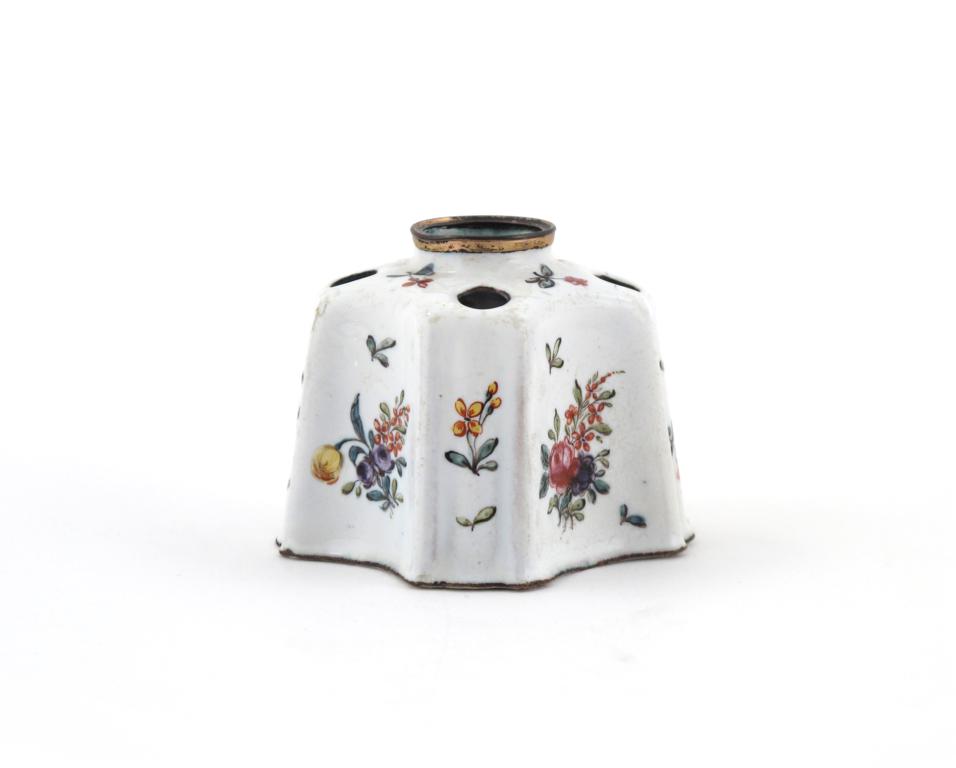A South Staffordshire enamel inkwell c.1770, of chamfered square form, painted with polychrome sprays of flowers and single stems on a white ground, the top with four small holes around a central metal-mounted hole, 4.3cm high.