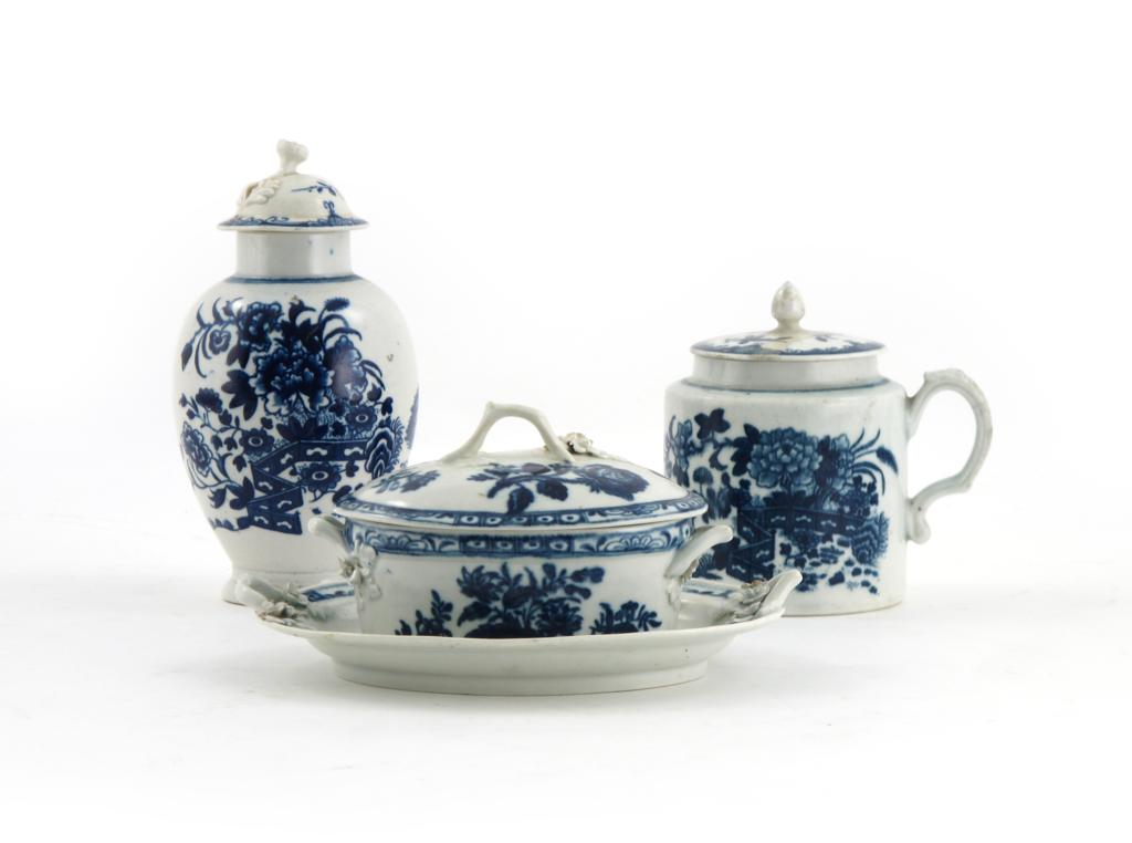 A small collection of Worcester blue and white porcelains 2nd half 18th century, including a butter tub with cover and stand, printed with the Rose-Centred Spray group, a tea canister and cover, and a mustard pot with associated cover, all printed with the Fence pattern, hatched crescent marks, some restorations, 18cm max. (7)