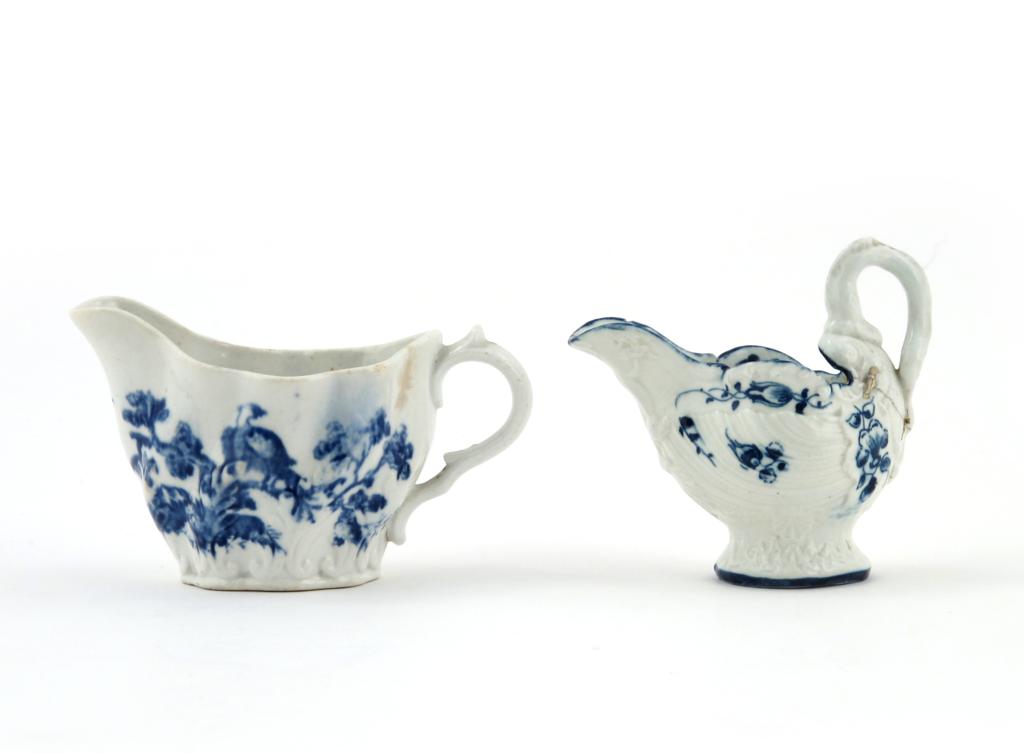 A Worcester blue and white dolphin ewer creamer c.1765-70, shell moulded and with dolphin decoration beneath the spout, painted with flower sprays, and a moulded Coalport creamer painted with birds on branches in the manner of Rogers, the ewer with damage to the handle, 11.5cm max. (2)