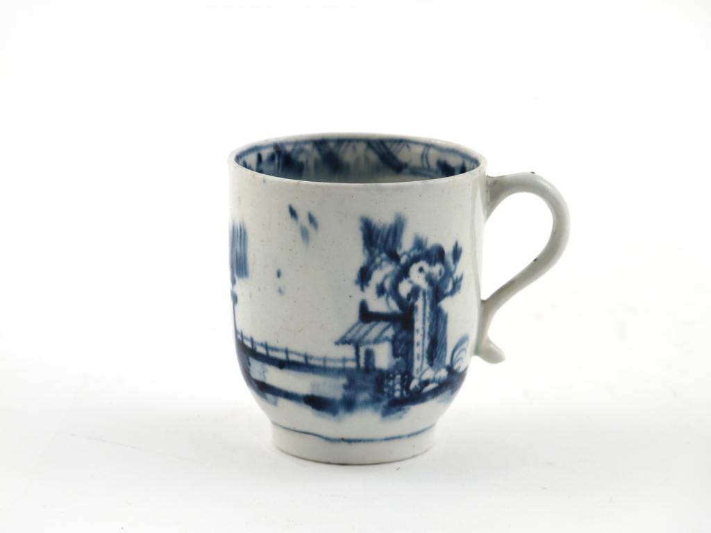 A Lowestoft blue and white coffee cup c.1765-70, painted with a house on an island with a long bridge leading away from it, the interior with a hatched border, 6cm.