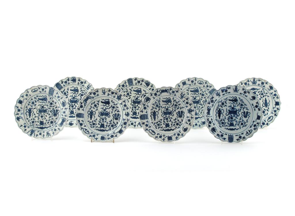 Eight Worcester blue and white small plates c.1780-85, with scalloped rims, painted with the Hundred Antiques pattern, each with a six character pseudo Chinese mark, some faults, 19cm. (8)
