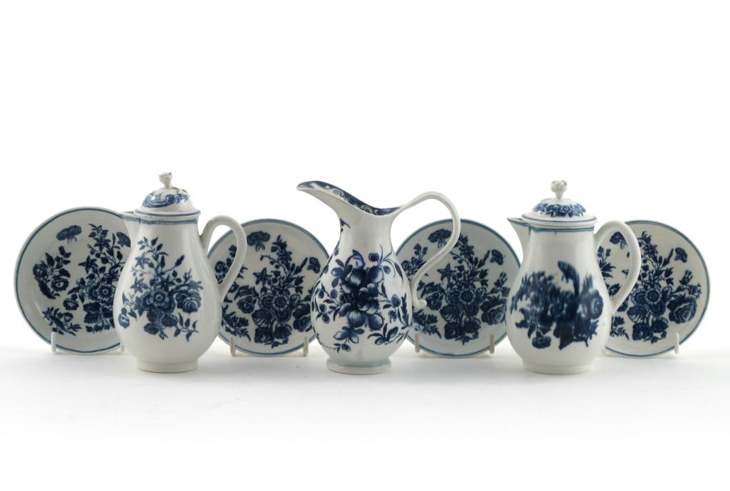 Two Worcester milk jugs and associated covers c.1775, and four Worcester and Caughley saucers, all printed with naturalistic floral patterns, and a Worcester milk jug with a helmet-shape painted with the Mansfield pattern, some faults, 13.5cm max. (9)