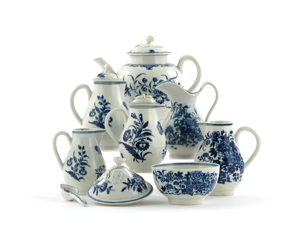 A collection of English blue and white tea wares 2nd half 18th century, mostly Worcester and Caughley, including four sparrowbeak jugs and two covers, one helmet-shaped jug, a teapot, a sugar bowl, a spoon, and two covers, some faults, 18.5cm max. (12)