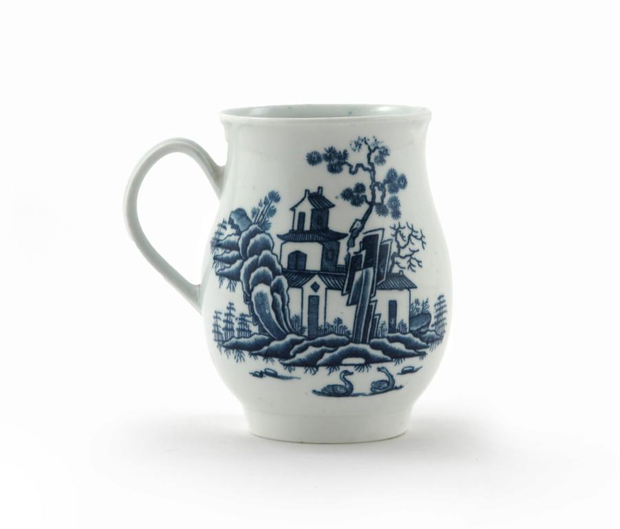A large Worcester baluster shaped blue and white mug c.1770, printed with the Plantation pattern, unmarked, 15cm.