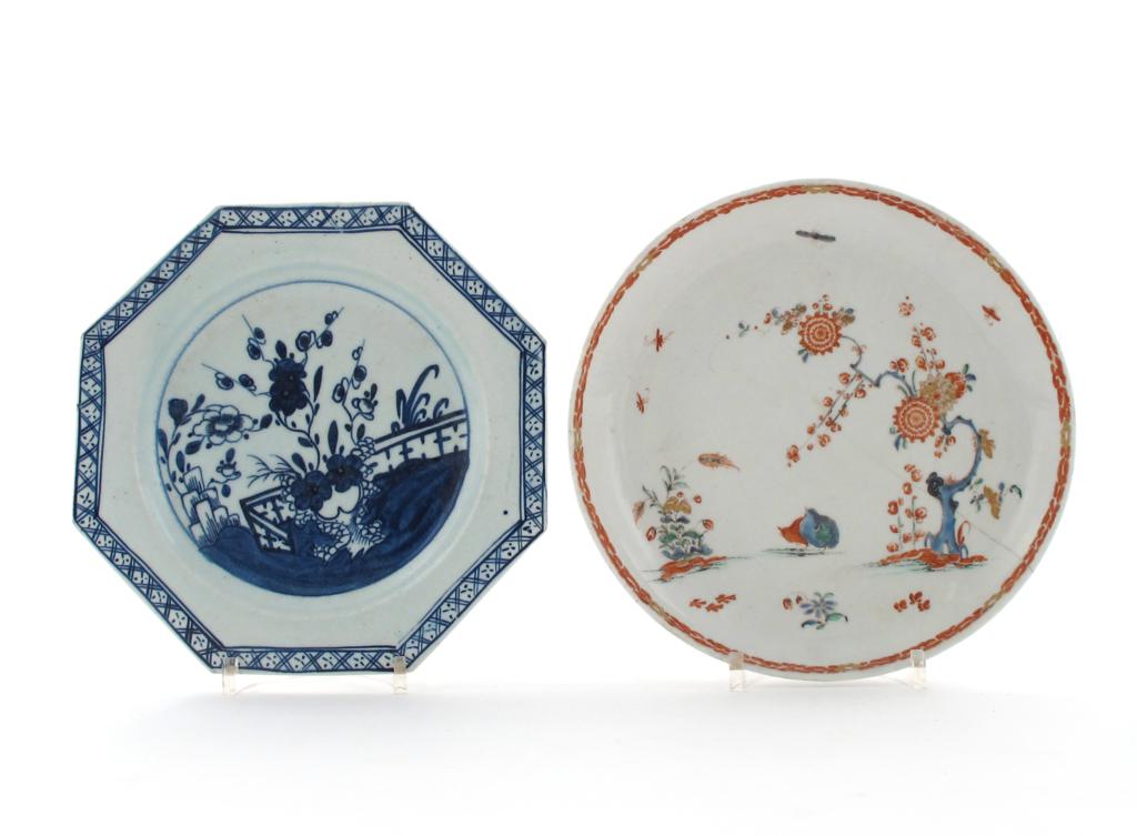 Two Bow plates c.1755-60, one painted in the Kakiemon palette with the Two Quail pattern, the other octagonal and painted in blue on white with prunus and peony in a fenced landscape, hairline crack to one, 20cm max. (2)