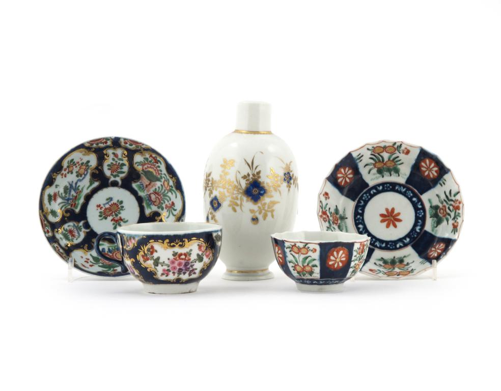 A Worcester fluted teabowl and saucer c.1770, decorated with a Japan pattern, a Worcester cup painted with panels of flowers on a blue scale ground, a similar saucer with panels of Kakiemon flowers, and an ovoid tea canister decorated with a blue and gilt flowering sprig, script W mark to the tea canister, seal marks to the rest, the cup cracked, 15cm max. (5)