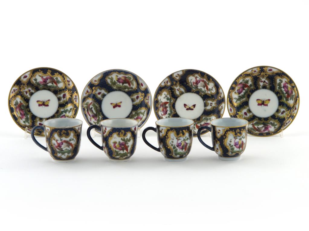 Four Worcester-style coffee cups and saucers, painted with panels of exotic birds and colourful moths reserved on a blue scale ground, blue square seal marks, 12.5cm. (8)