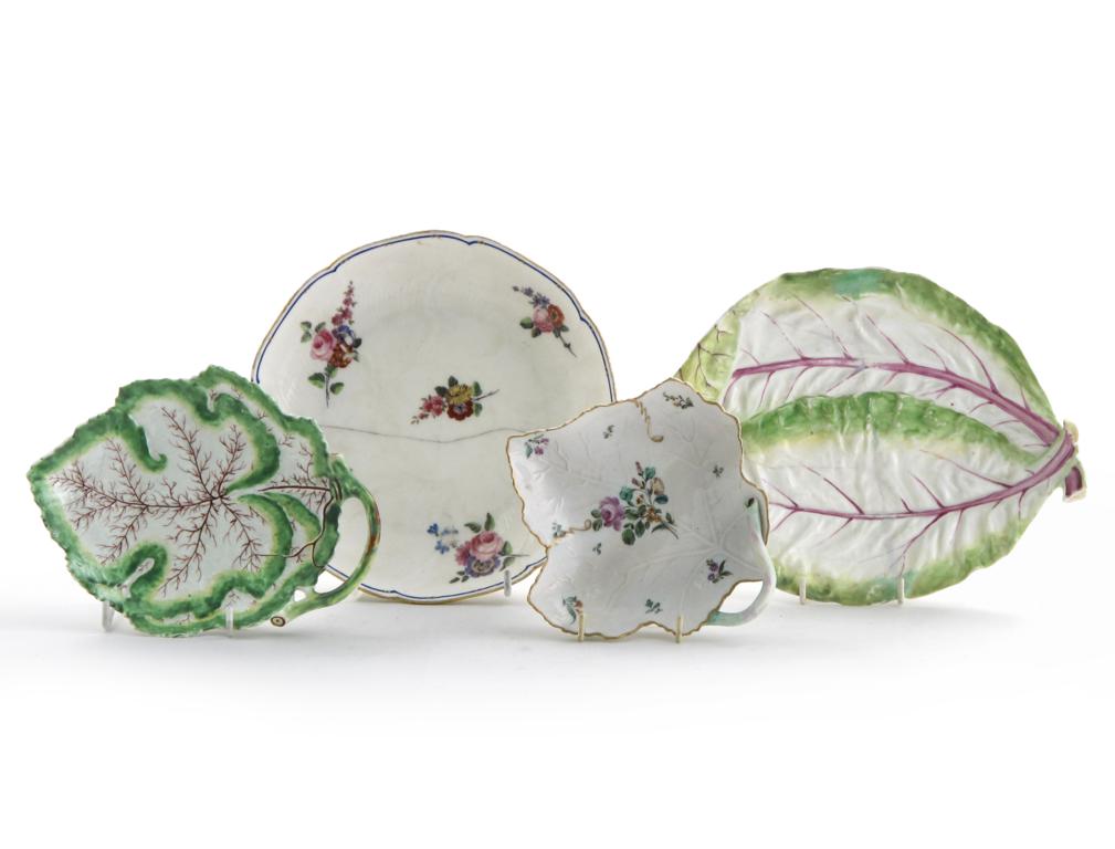 Three leaf-moulded dishes 18th century, one Chelsea of two cos leaves picked out in green and puce enamels, one a Cozzi vine leaf with flower sprays, the last Worcester, and a Sèvres lobed dish painted with flowers within a blue line rim, various marks, damages and repairs, 24.5cm max. (4)
