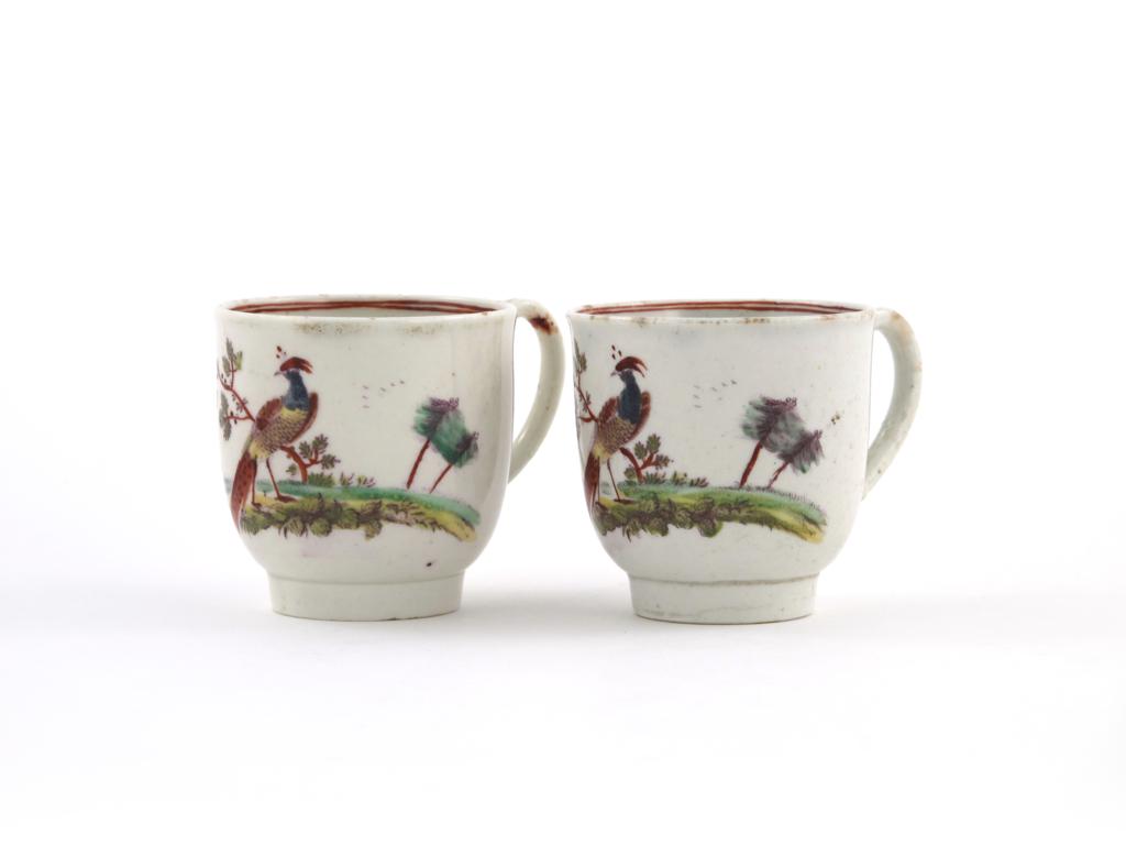A pair of Seth Pennington Liverpool coffee cups c.1780, printed and coloured with a Fancy Birds pattern, the exotic birds standing before trees, the interiors with iron red bands, 6.2cm. (2)