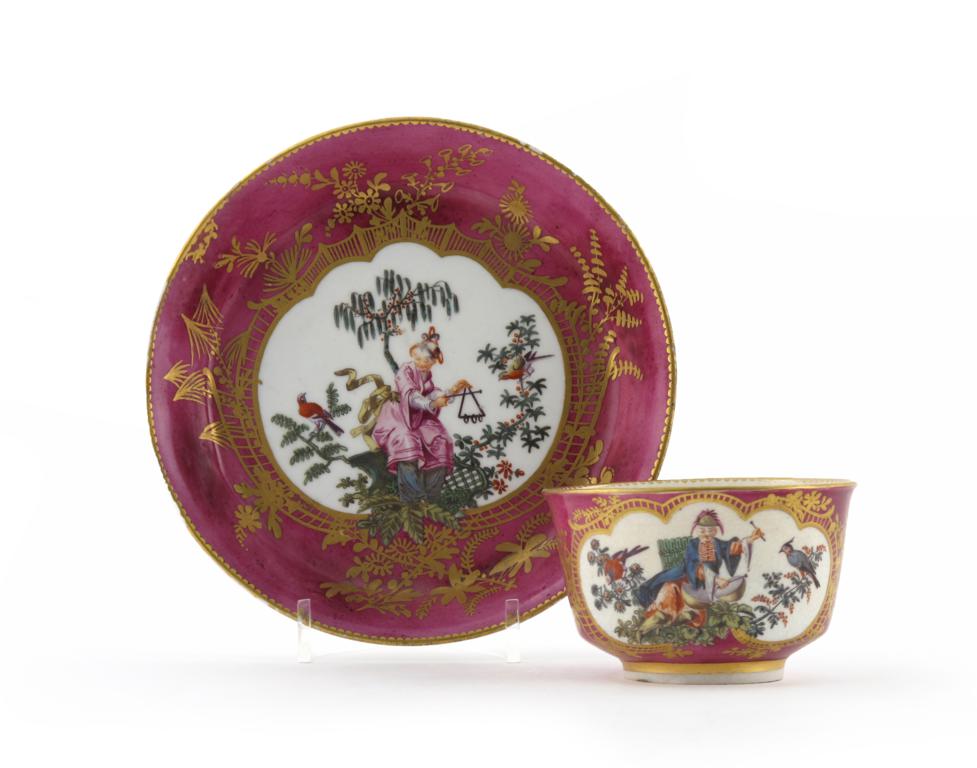 A Chelsea teacup and saucer c.1760-65, finely painted with chinoiserie scenes of Oriental musicians seated amidst rococo foliage with birds perched around, reserved on a claret ground, gold anchor marks, some faults, 13.5cm. (2)