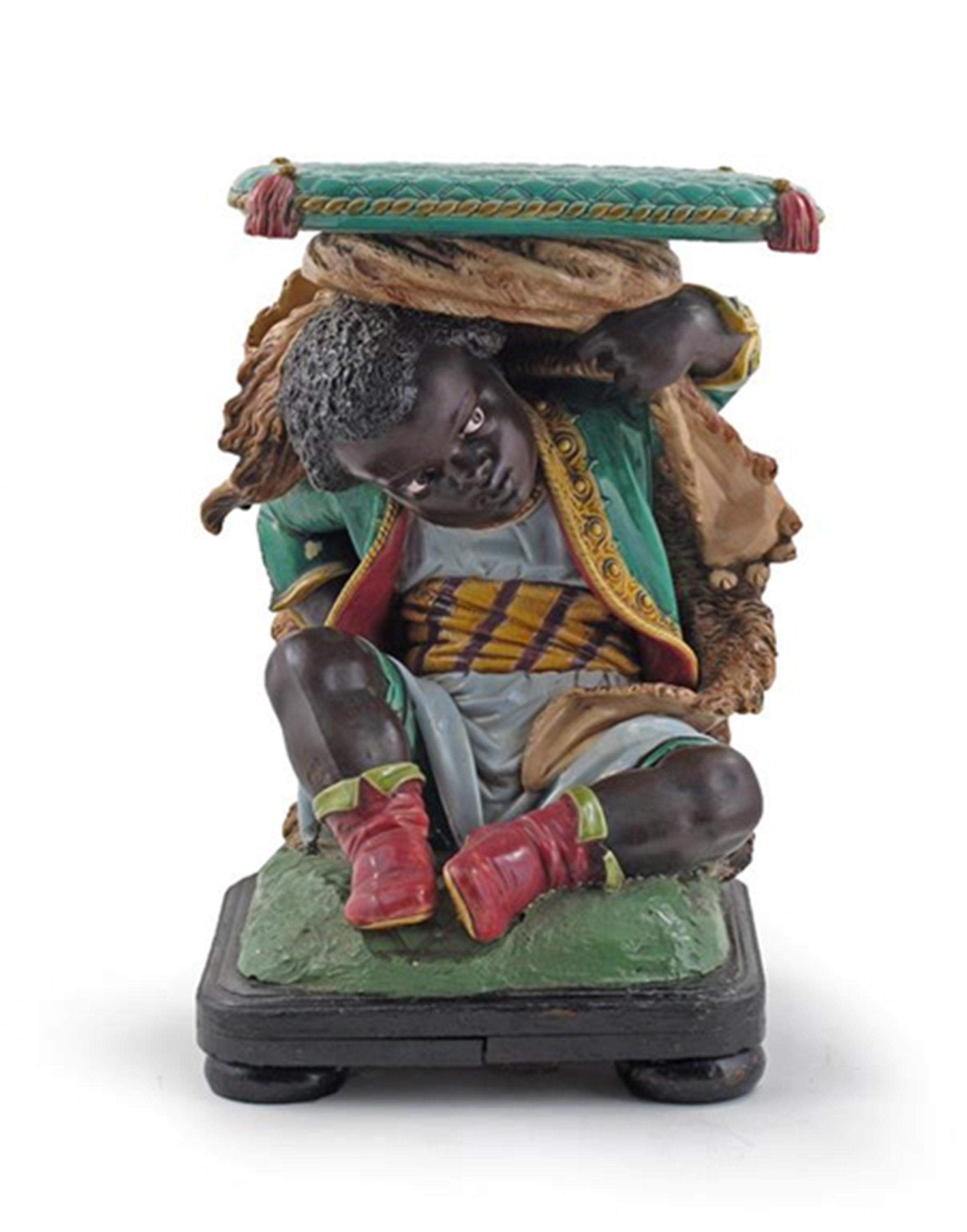 A Minton Majolica garden seat 2nd half 19th century, modelled as a seated blackamoor boy wearing a brocaded jacket and draped in a lion skin, supporting a green tasselled cushion on his head, impressed marks, shape number 1225 and date code for 1866, the base cushion rebuilt, 53cm.