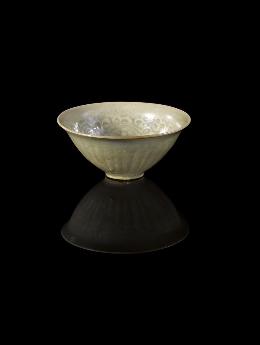 A Chinese Yaozhou celadon moulded small bowl Northern Song dynasty, the conical body with a flared rim, raised on a short foot and incised to the interior with chrysanthemum heads on a scrolling foliate ground, 11cm dia.