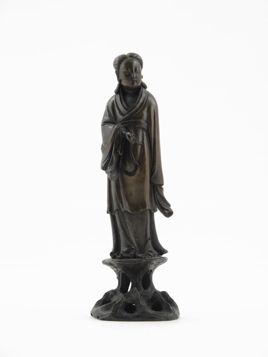 A Chinese bronze model of Guanyin late Ming dynasty, standing on a high rocky plinth, and wearing long, flowing robes, her right hand raised to clasp a pouring vessel, 28cm.