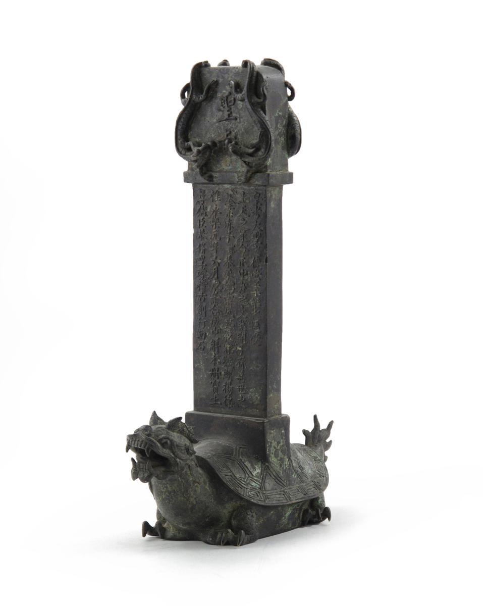 A Chinese bronze spirit tablet, resting on the back of a horned turtle-like beast, cast with a ferocious expression and with two small, sinuous dragons, the tablet cast with five rows of calligraphy which includes the date for the first year of the Yongle reign which corresponds to 1403, 33.5cm.