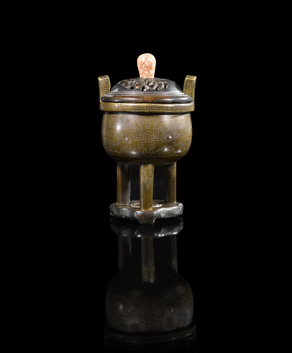 A Chinese bronze silver wire-inlaid incense burner 17th century, with upright handles to the rim, the bowl supported on three tall legs, the body decorated with an archaistic design of taotie, key fret and lappets, the base with a two character signature which reads shi sou, a later wood cover, 12.7cm. (2)