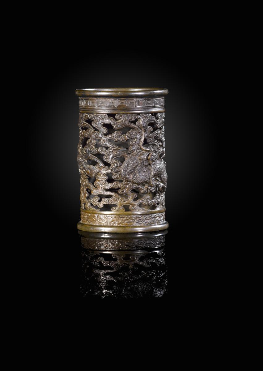 A good Chinese reticulated bronze bitong Kangxi 1662-1722, cast with two scaly dragons, one clutching a sacred pearl and the other with its head turned, both set on a ground of ruyi-like cloud scrolls, the rim with a key fret band, the base cast as breaking waves, 11.7cm.
