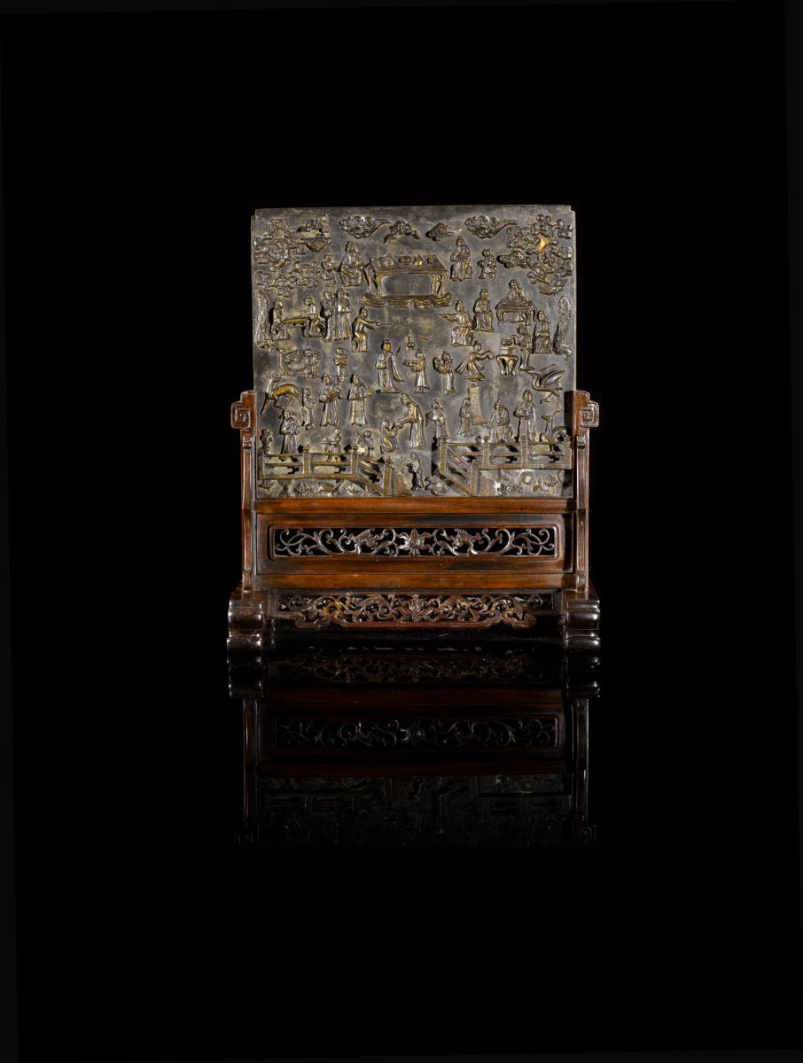A rare Chinese cast bronze scholar's table screen 17th/18th century, depicting numerous figures with pine sprays, cloud scrolls, a crane and a deer and other auspicious things above a reticulated fence with lotus and a turtle below, with a hardwood stand, the screen 24cm x 26.5cm, 35.5cm overall. (2)