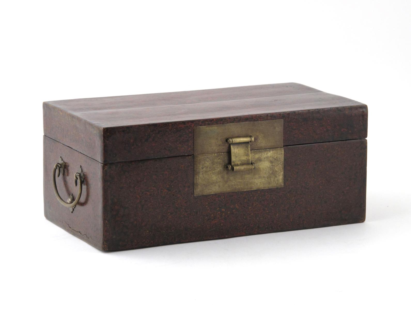 An unusual Chinese xipi lacquer box Kangxi 1662-1722, the rectangular form with a hinged lid and brass mounts, a scrolling fitting to the front and loose handles to each end, 15.9cm x 36.2cm.