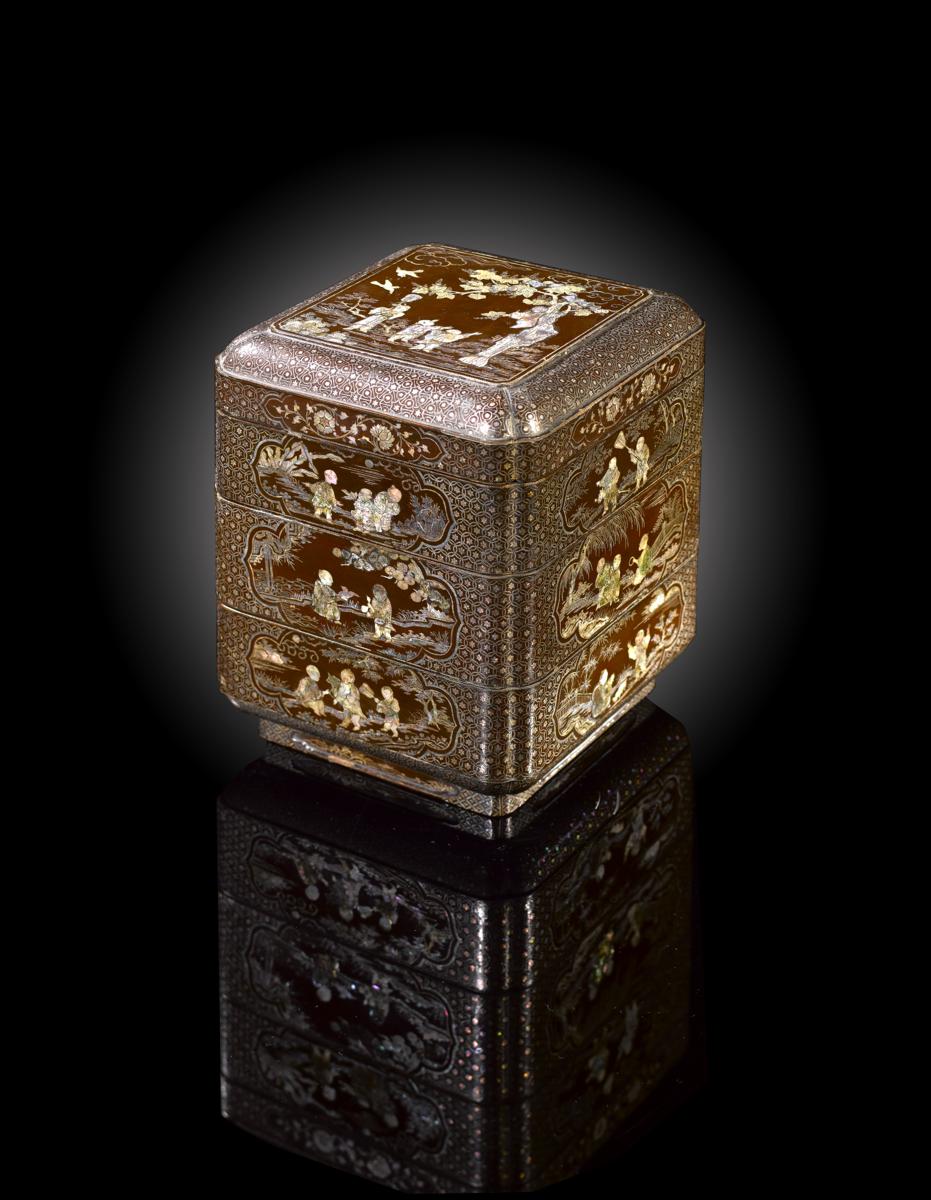 A Chinese laque burgauté three tiered box probably 16th century, inlaid in mother of pearl, the cover with a scene of children playing beneath a flowering tree, the sides with further cartouche-shaped panels with children holding birds and fans and playing in gardens, all on a geometric cash-diaper ground, 24.8cm. (4)