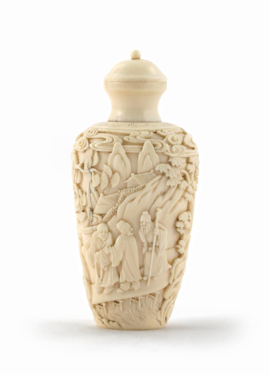 λ A good Chinese ivory snuff bottle 19th century, carved in relief depicting Yu Boya visiting Zhong Ziqi to discuss the music of qin before a mountainous landscape and a pagoda, with pine and clouds, a band of key fret to the shoulder, 9cm.