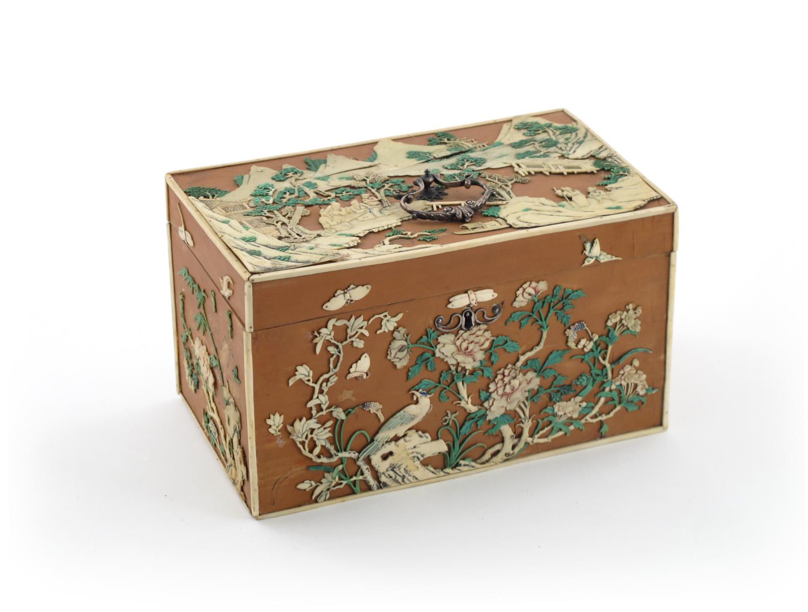 λ An unusual Chinese veneered bamboo caddy late 18th/early 19th century, each side applied with stained ivory in green, red and blue, depicting chrysanthemum, birds and insects, the hinged top with figures in a watery, mountainous landscape amidst pagodas and pine, the lock, hinges and handle silver, 23.5cm.
