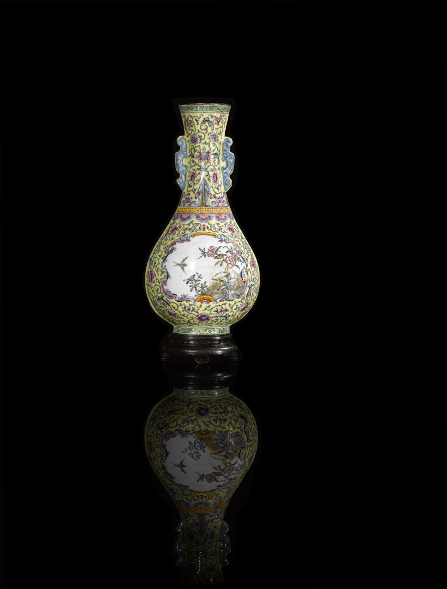 清乾隆/嘉慶 銅胎畫琺瑯黃地開光喜上眉梢壁瓶
