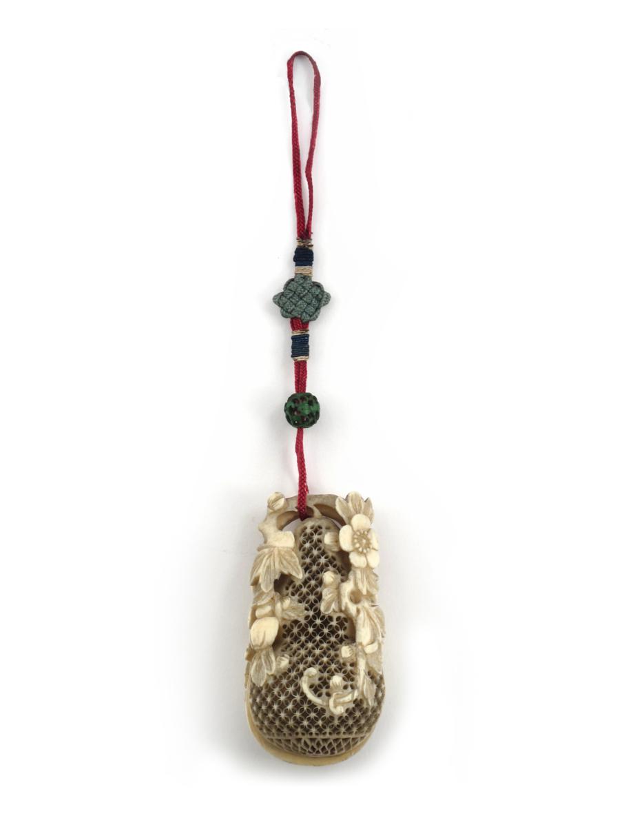 λ A Chinese ivory reticulated perfume box 19th century, in two sections, carved as a gourd issuing from a branch, with smaller fruits and flowers to each side, a red silk cord with a stained ivory bead for suspension, 6.5cm. (2)