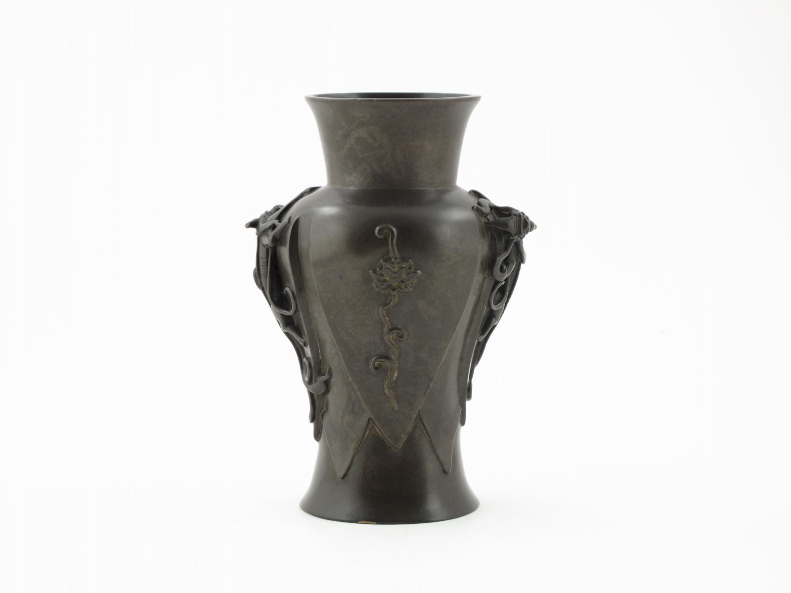 A Chinese cast bronze baluster vase 18th/19th century, formed as shield-shaped lappets, two decorated with lotus sprays, the sides with scrolling chilongs, the base with a six character Xuande mark, 21.7cm.
