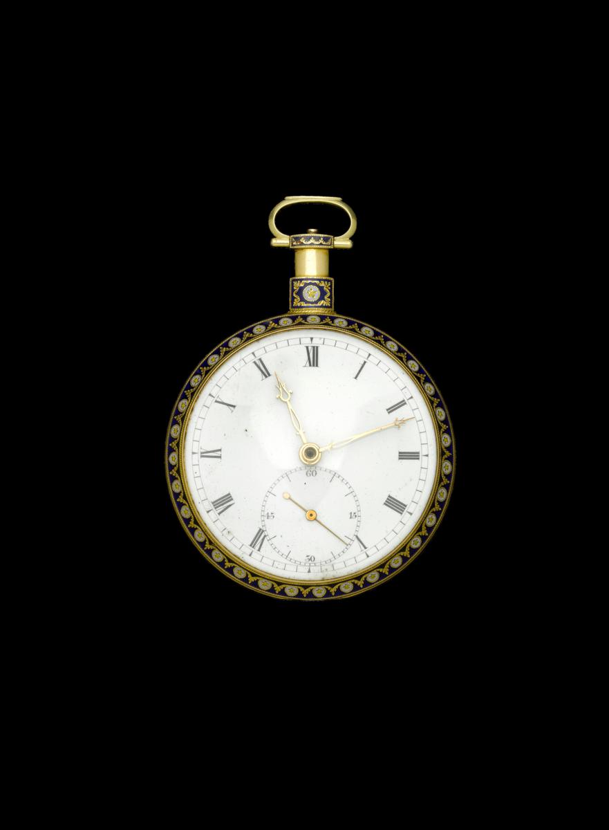 A rare and fine documentary English gold and enamel duplex pocket watch made for the Chinese market c.1820, by William Ilbery, the white enamel dial with a large subsidiary second hand and gold hour and minute hands, pierced with tulip buds. The movement profusely engraved with scrolling foliage and flowerheads, the duplex escapement with a five-armed steel balance and diamond endstone. Signed 'Ilbery, London, no.5825' on the balance cock foot, the hanging going barrel with stop work, the flip-up cuvette engine turned with a geometric design, the reverse finely decorated with eight peacock feathers encircled by ropes of linked laurel and flowers, all on a dark blue basse taille enamel ground. The bezels and pendant enamelled with rosettes and gold swags, 5.8cm dia.