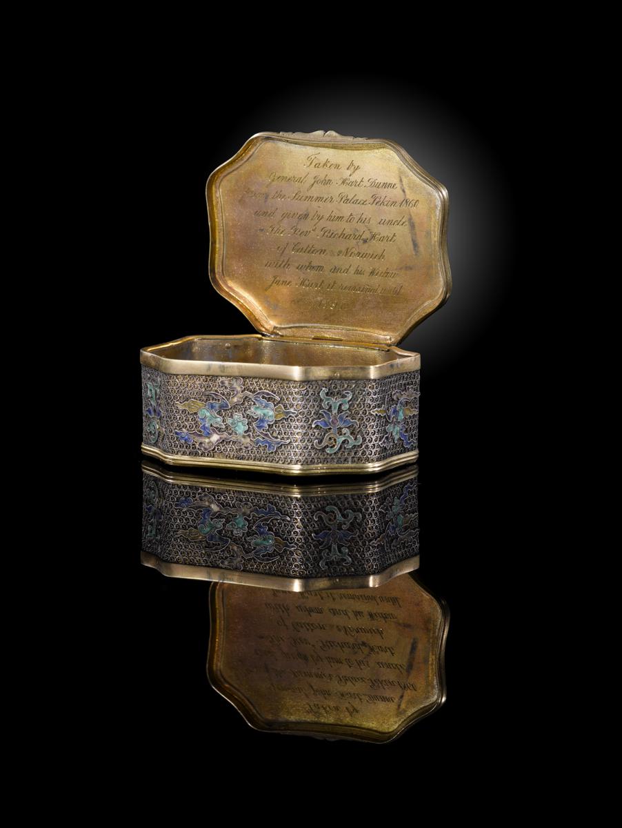 The interior of the lid is inscribed 'Taken by General John Hart Dunne from the Summer Palace, Pekin, 1860, and given to him by his uncle, the Revd. Richard Hart of Catton, Norwich, with whom and his widow Jane Hart it remained until 1897'.