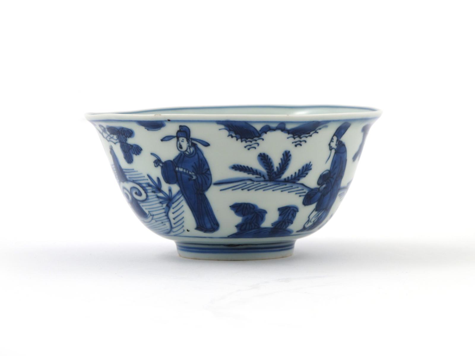 A Chinese blue and white bowl six character Jiajing mark but Wanli, painted with four figures to the exterior in a landscape with trees, rocks and scrolling clouds, the interior with a fifth figure amidst clouds, 12cm.