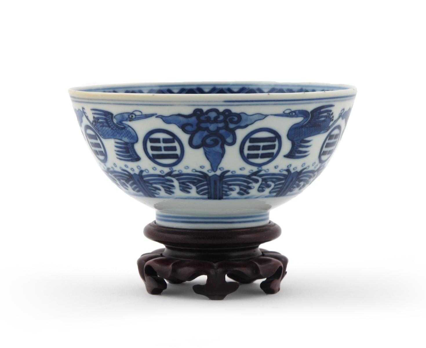 A Chinese blue and white bowl six character Guangxu mark and of the period 1875-1908, painted with the Eight Trigams, divided by flying cranes and stylized clouds above breaking waves, a wood stand, 14cm. (2)