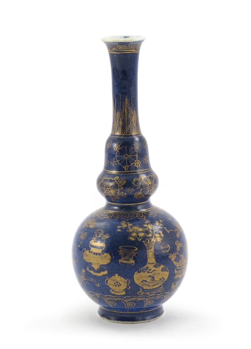 A Chinese blue ground bottle vase Kangxi 1662-1722, the body raised on a short foot and decorated in gilt with vases and auspicious objects beneath a band of ruyi-heads, the knopped neck with flowerheads and stiff leaves, 18.5cm.