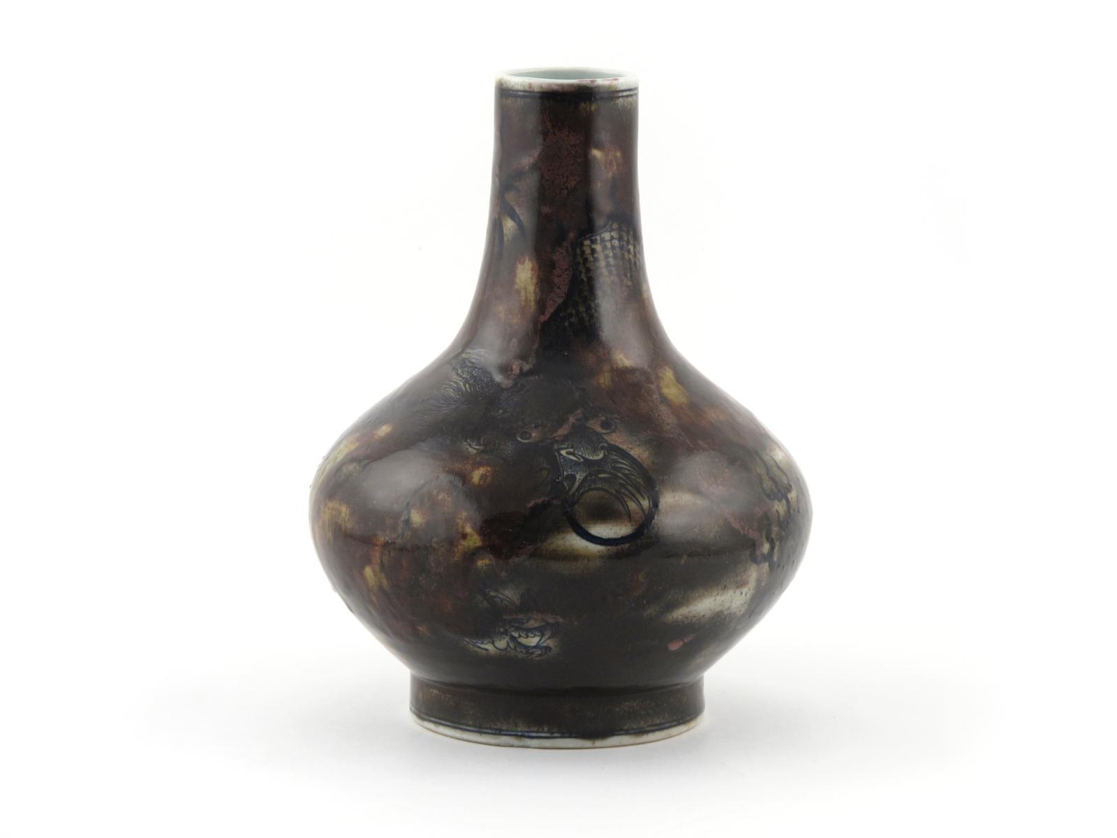 A Chinese bottle vase, painted with a large scaly dragon and a flaming pearl emerging from a brown flambé glaze, the base with six character Guangxu mark, 32cm.