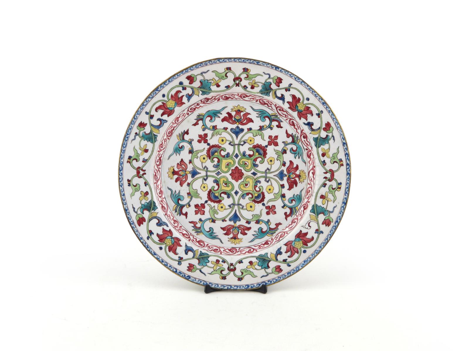 A Chinese Canton enamel famille rose small plate 18th century, painted with a formal design of stylized leaf scrolls and flowers, the reverse with a spray of cherries, melon and finger citron, 18.5cm.