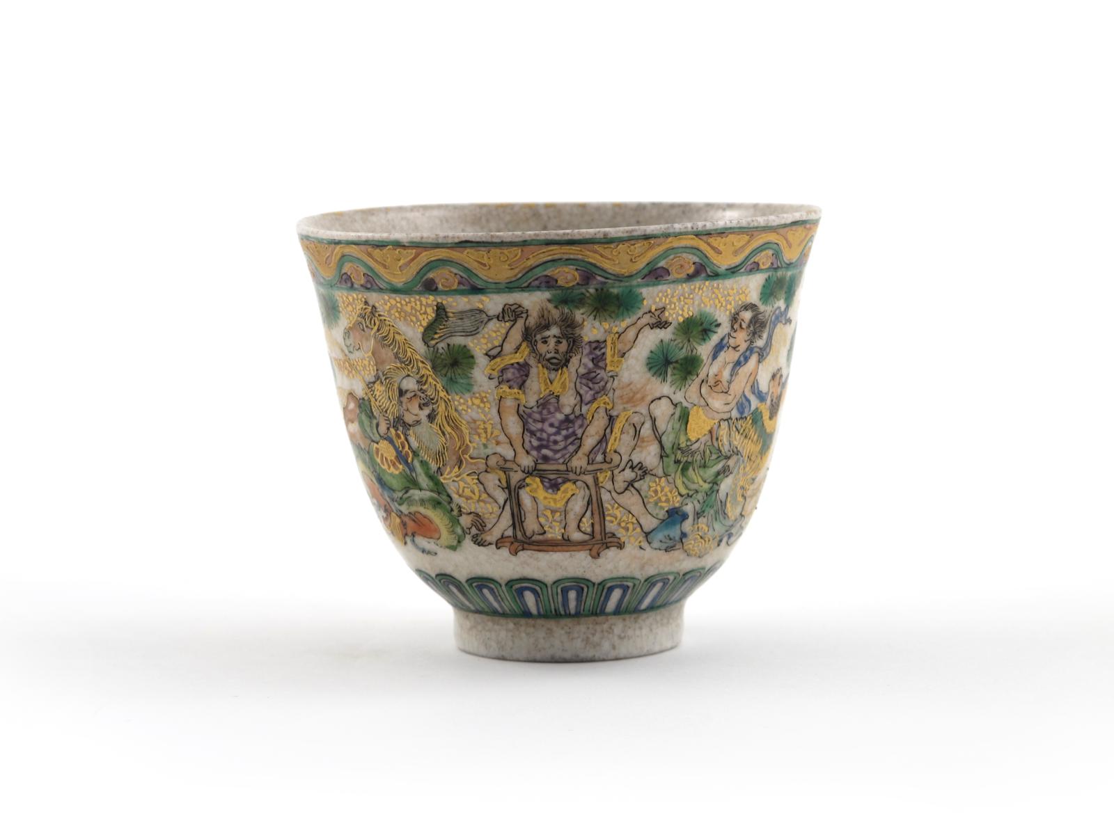 A Japanese small flared Kyoto ware bowl 19th century, painted with figures engaged in various everyday pursuits amidst pine between stylized borders, with traces of gilding to the surface and rim, 7.7cm.
