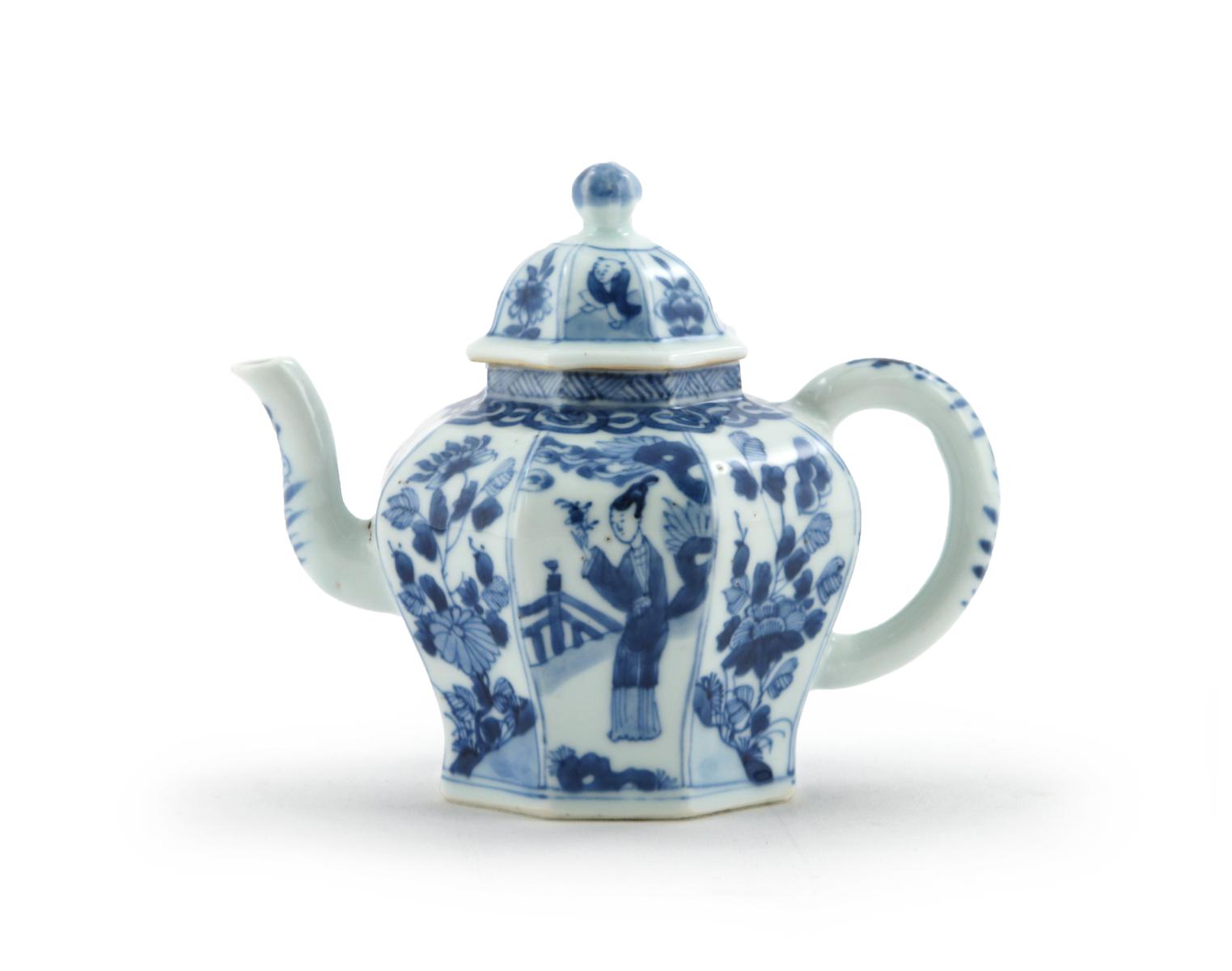 A Chinese blue and white teapot and cover Kangxi 1662-1722, the octagonal body painted with panels containing floral sprigs and ladies in fenced gardens beneath a band of ruyi-heads to the shoulder, 16cm. (2)