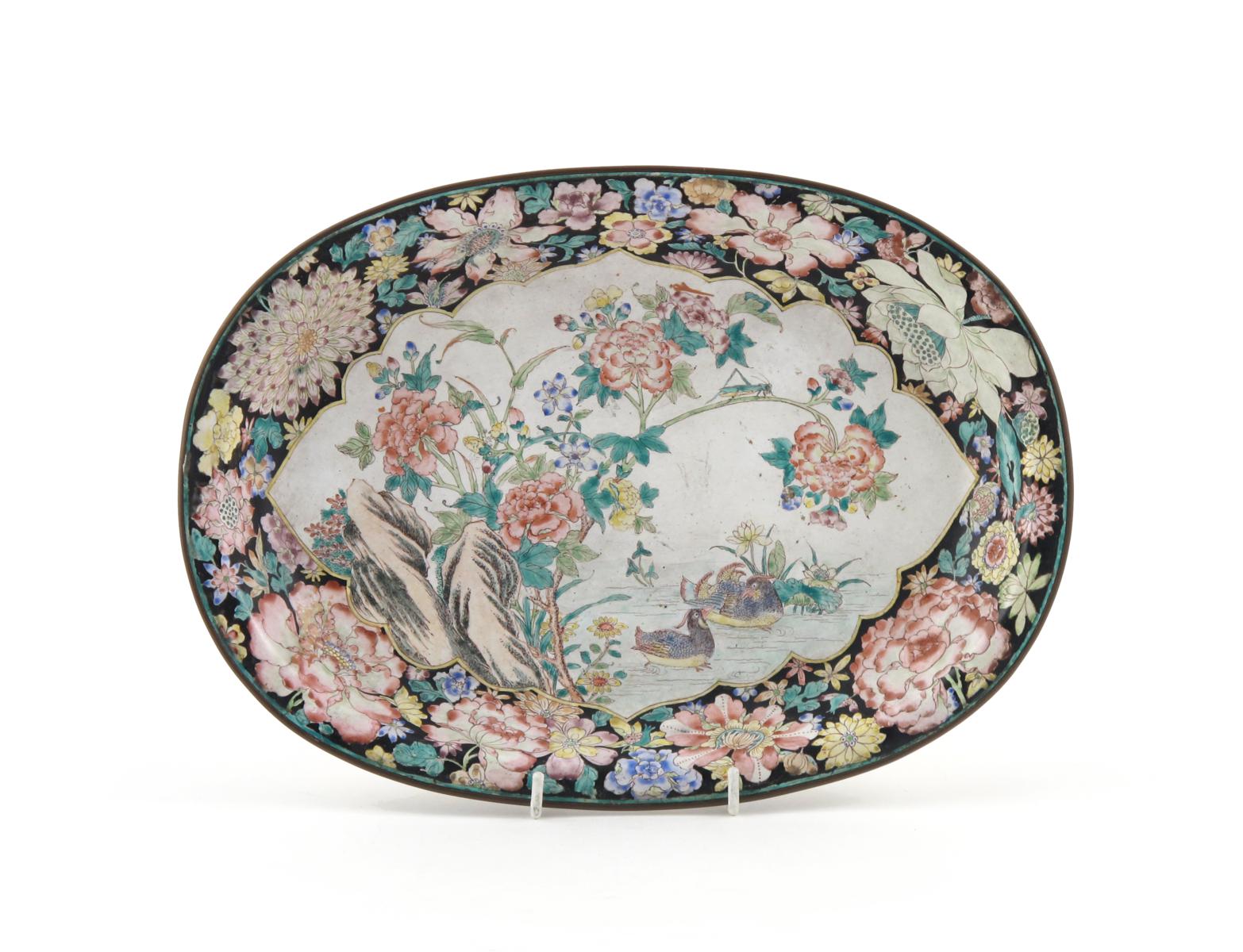 A Chinese Canton enamel famille rose oval dish 19th or 20th century, decorated with a large panel containing a pair of Mandarin ducks beneath peony within a floral border, the reverse with a five character seal mark, 31cm.