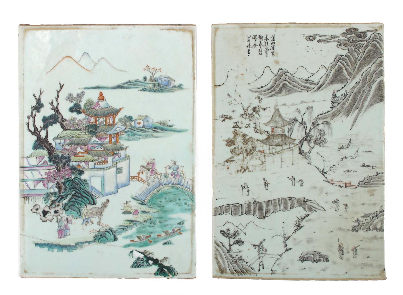 A Chinese famille rose rectangular porcelain panel 19th or 20th century, painted with a large pagoda beside a pine tree and a river, with figures engaged in daily pursuits, and another in black and iron red depicting a similar subject and with five lines of calligraphy, 42.7cm x 30cm max. (2)