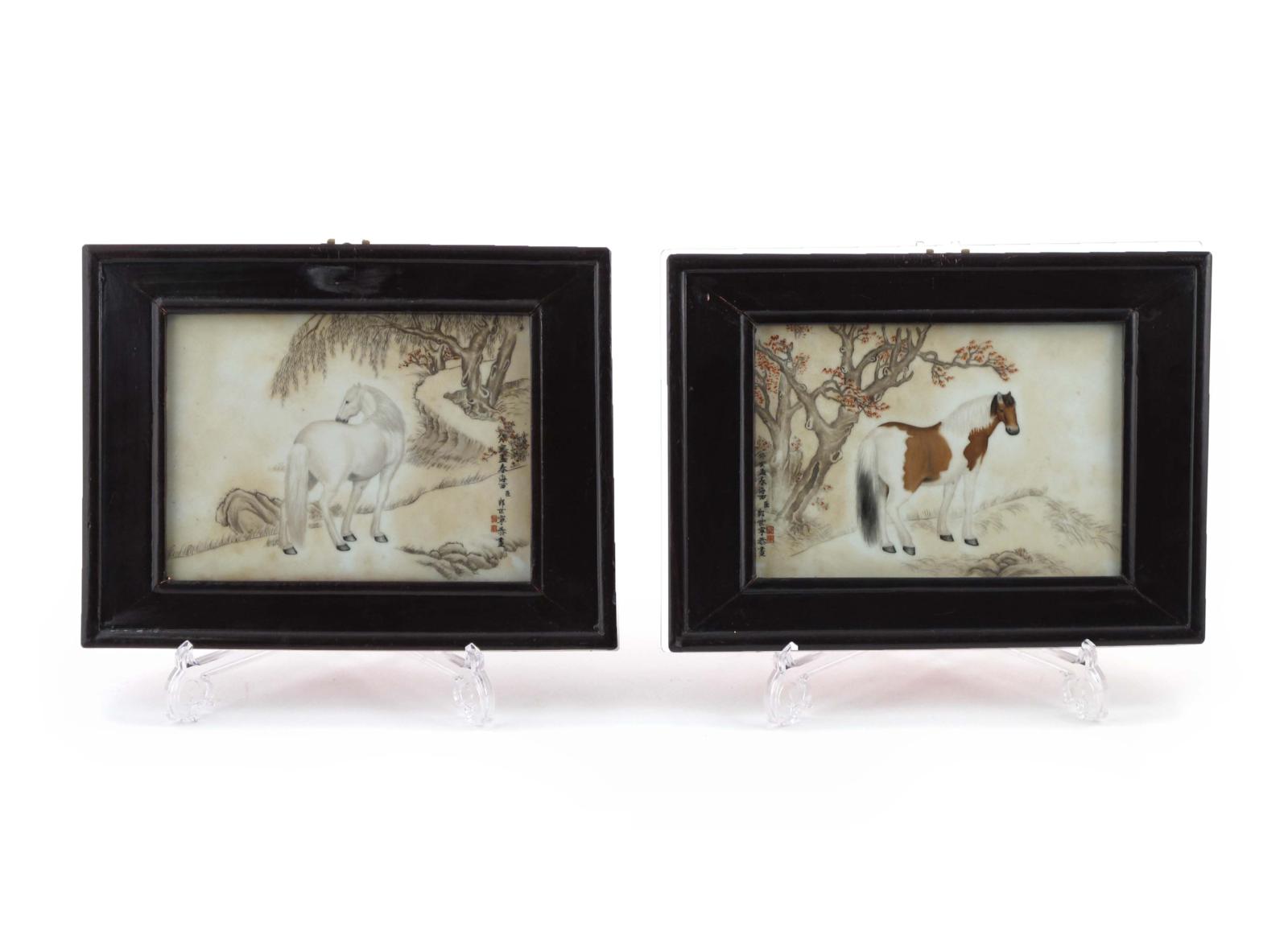 A pair of Chinese porcelain plaques 20th century, each depicting a horse beneath a gnarled blossoming tree before rockwork, and with calligraphy to one side, mounted in hardwood frames, the plaques 23.5cm x 17cm. (2)