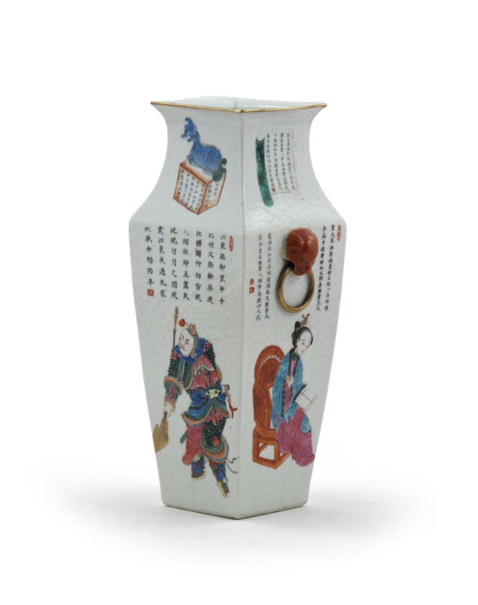A Chinese famille rose square-section vase 19th century, moulded with animal mask handles, each face painted with a figure and lines of calligraphy, 29.2cm.