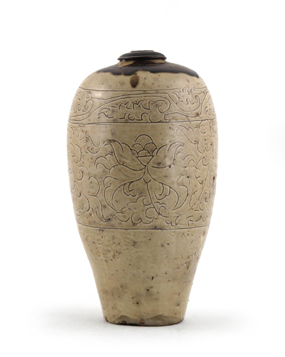 A Chinese Cizhou ovoid vase Song dynasty 960-1279, heavily potted and incised with a scrolling foliate design, the glaze a pale brown, with a compressed hardwood fitting to the neck, 32.5cm. (2)