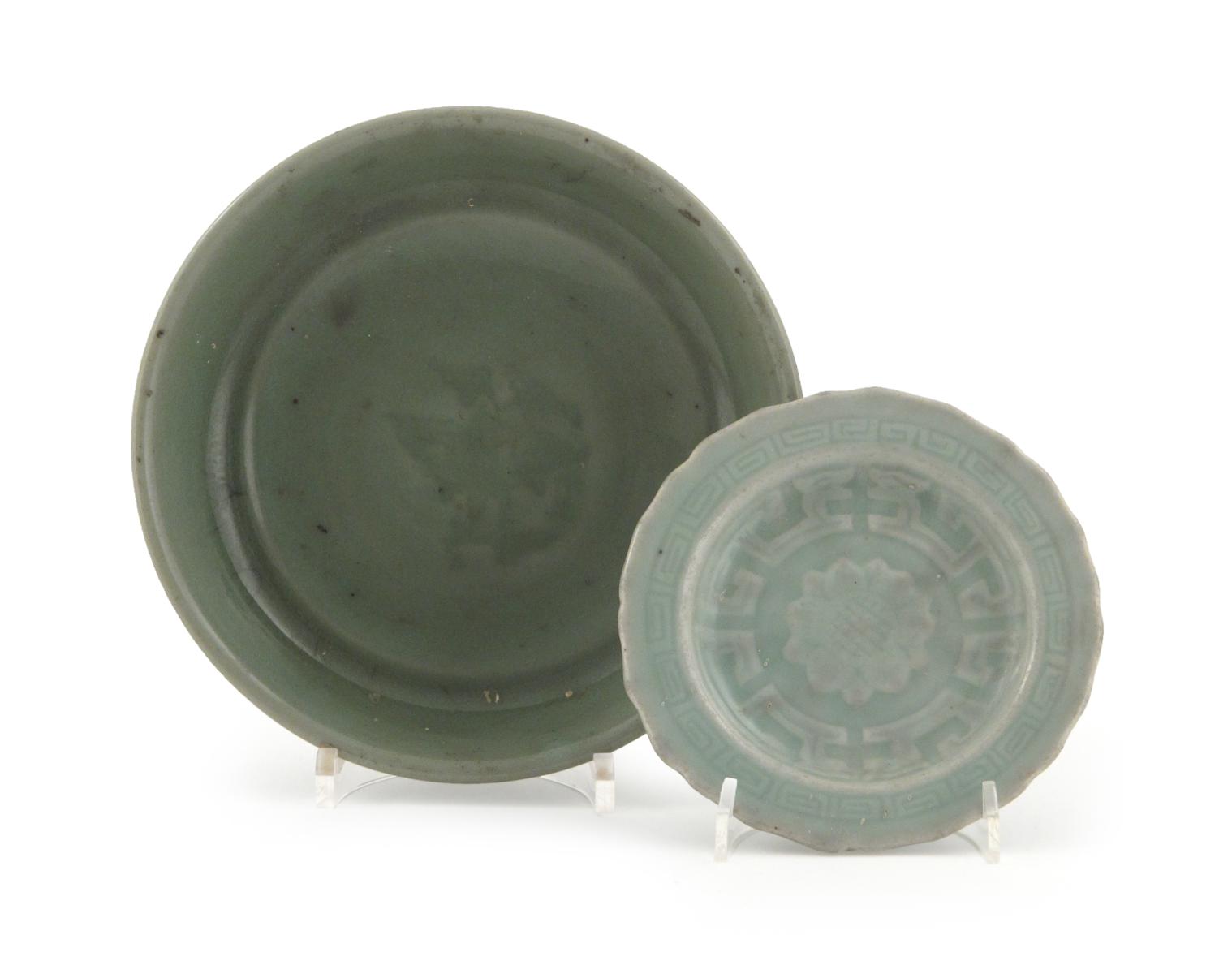 A Chinese celadon shallow bowl Ming dynasty, moulded with leaves, and another small celadon dish, 17.3cm. (2)