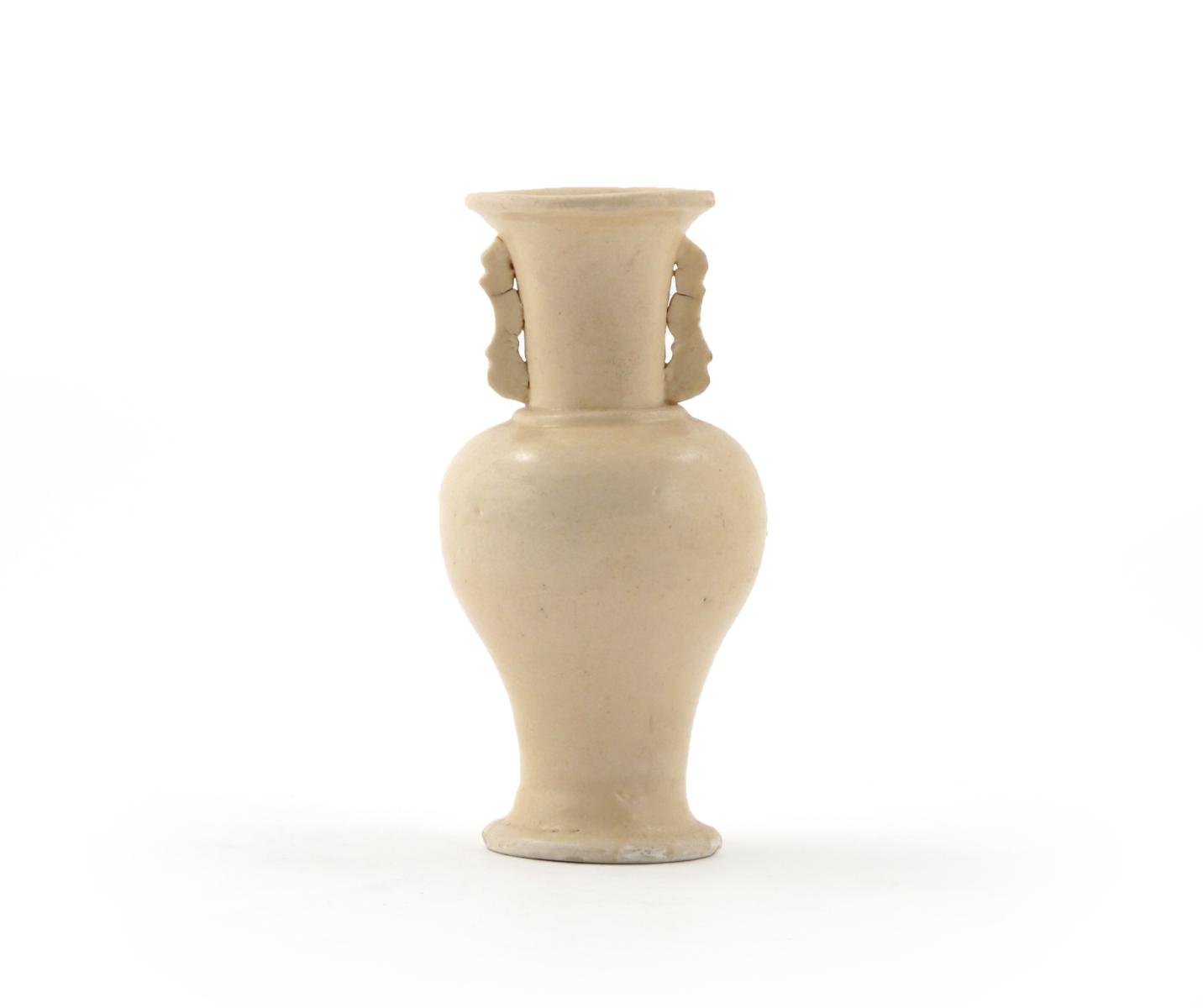 A Chinese miniature white glazed yen yen vase Tang dynasty 618BC - 906AD, the neck applied with shaped handles, the glaze stopping short of the foot, 12.6cm.