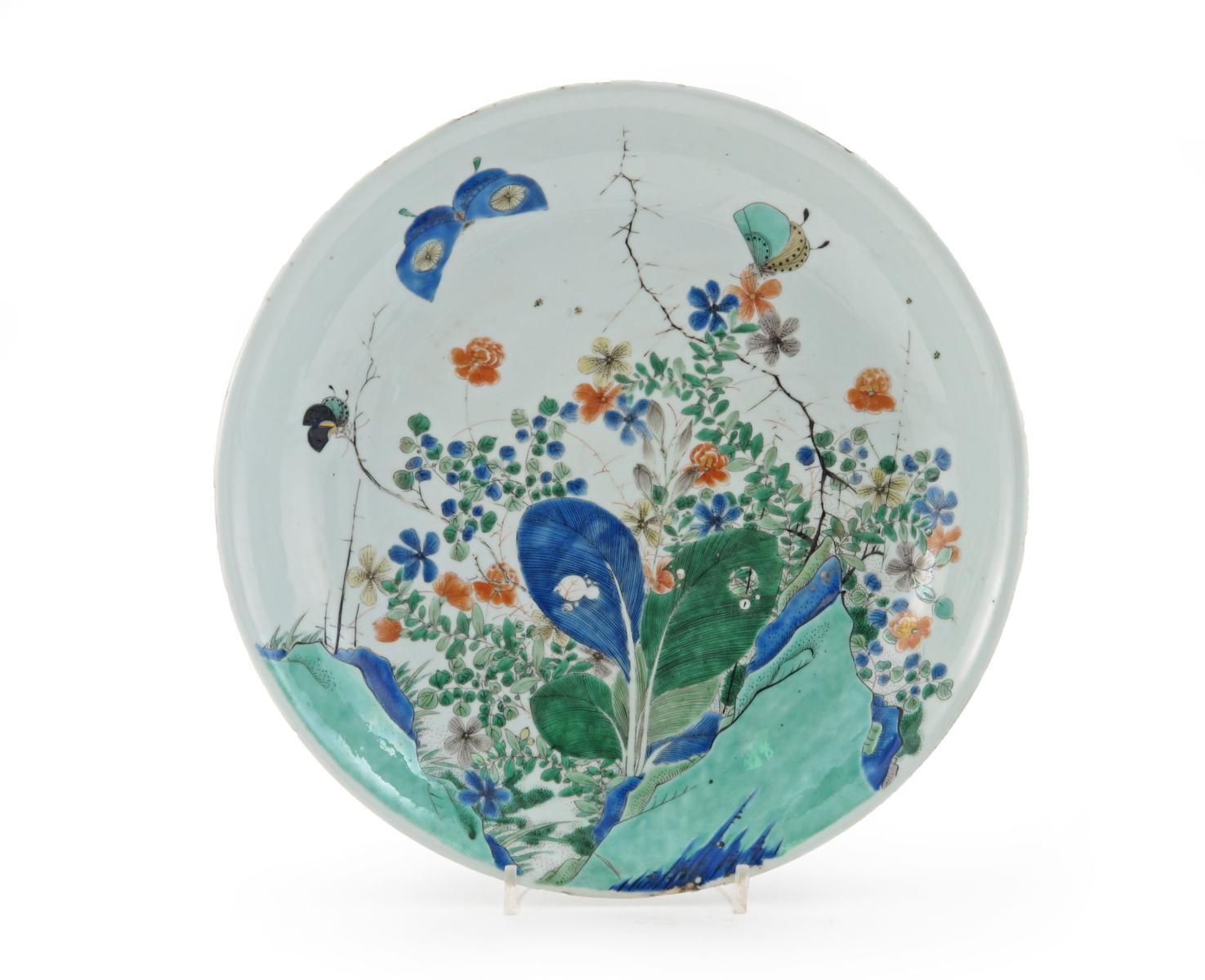 A Chinese famille verte dish Kangxi 1662-1722, painted with flowers and foliage issuing from green and blue rockwork and with butterflies, the reverse with a channelled footrim and a lingzhi mark, 35.2cm.
