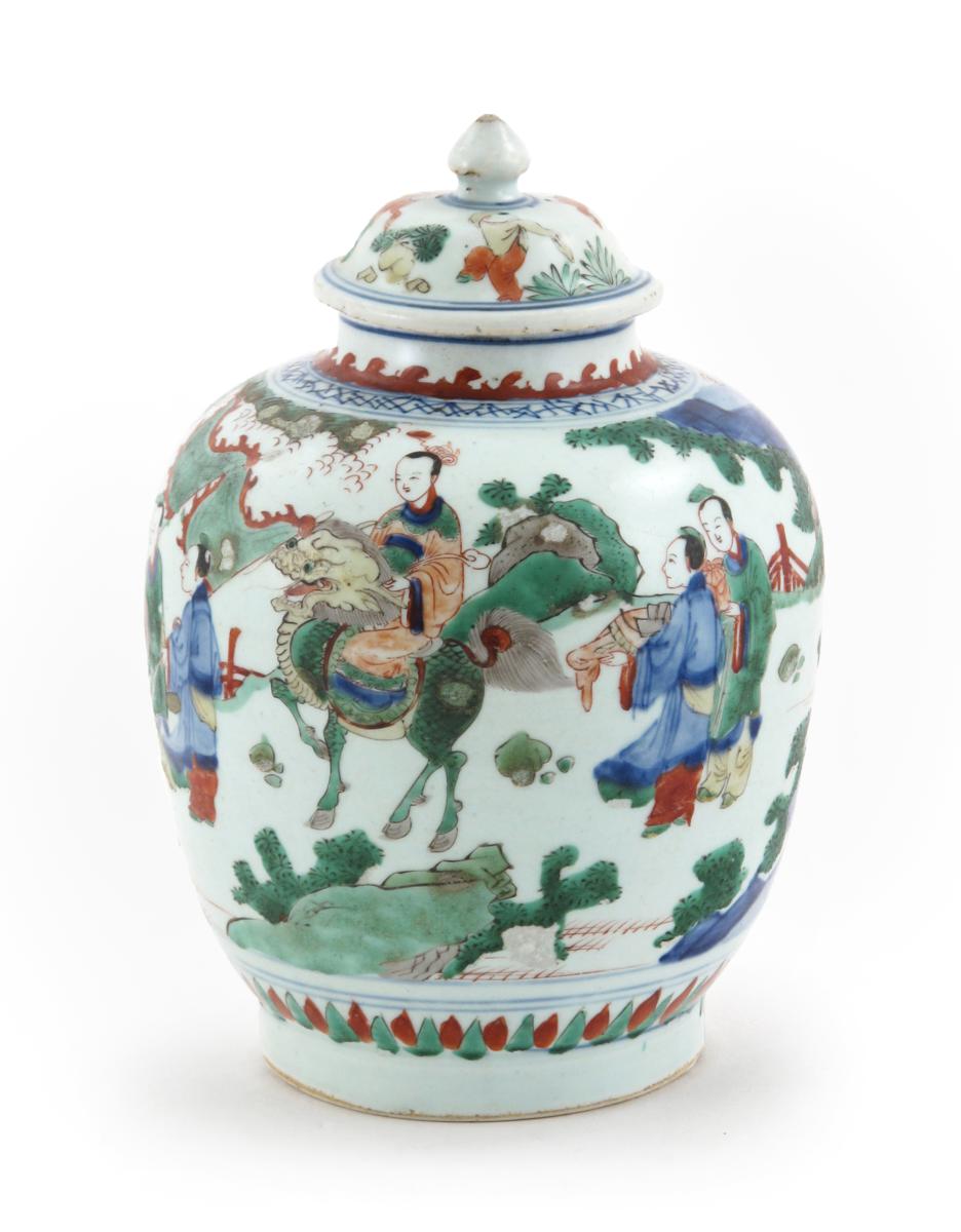 A Chinese wucai ovoid vase and cover 17th century, painted with a scene of the highest scholar riding a kylin, with bannermen and attendants in fenced rocky gardens with plantain, the cover with three boys, 29cm. (2)