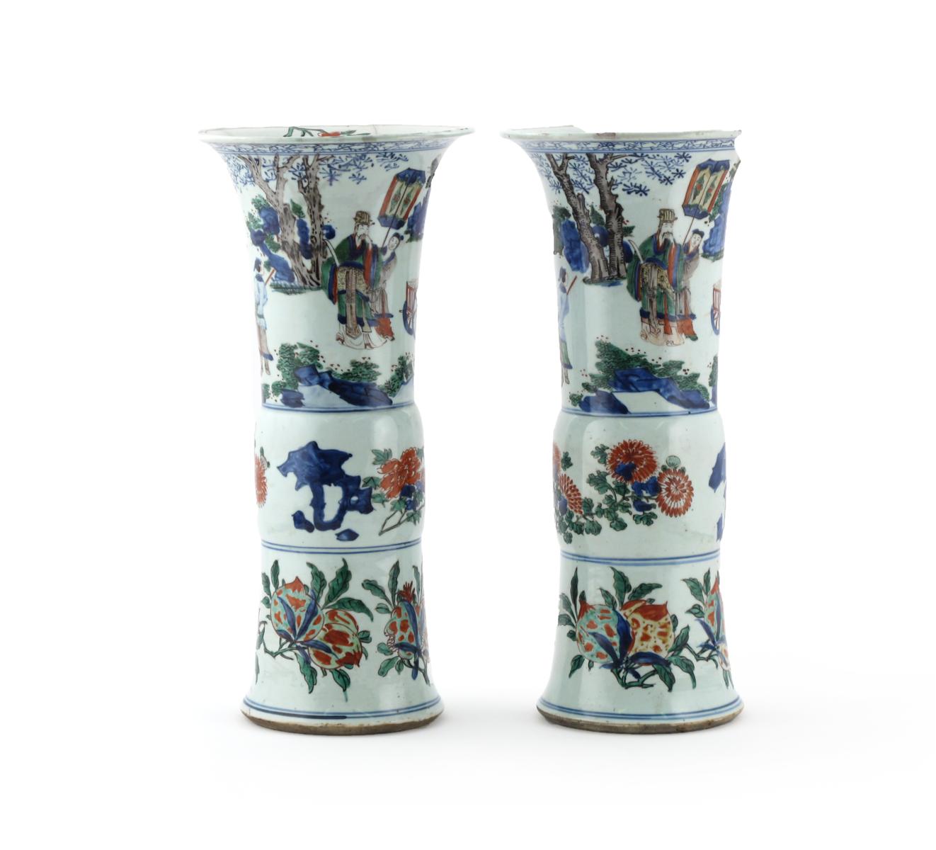 A pair of large Chinese wucai gu beaker vases 17th century, painted with figures and dignitaries in rocky landscapes above peony and pomegranate, 48.5cm. (2)
